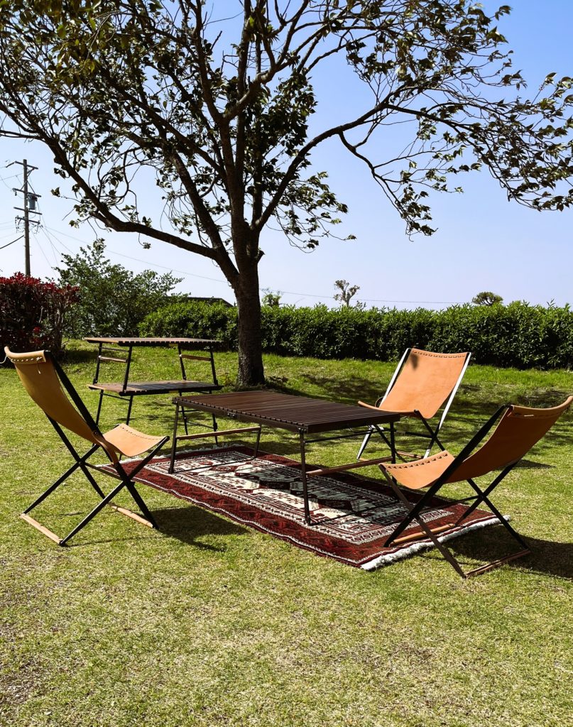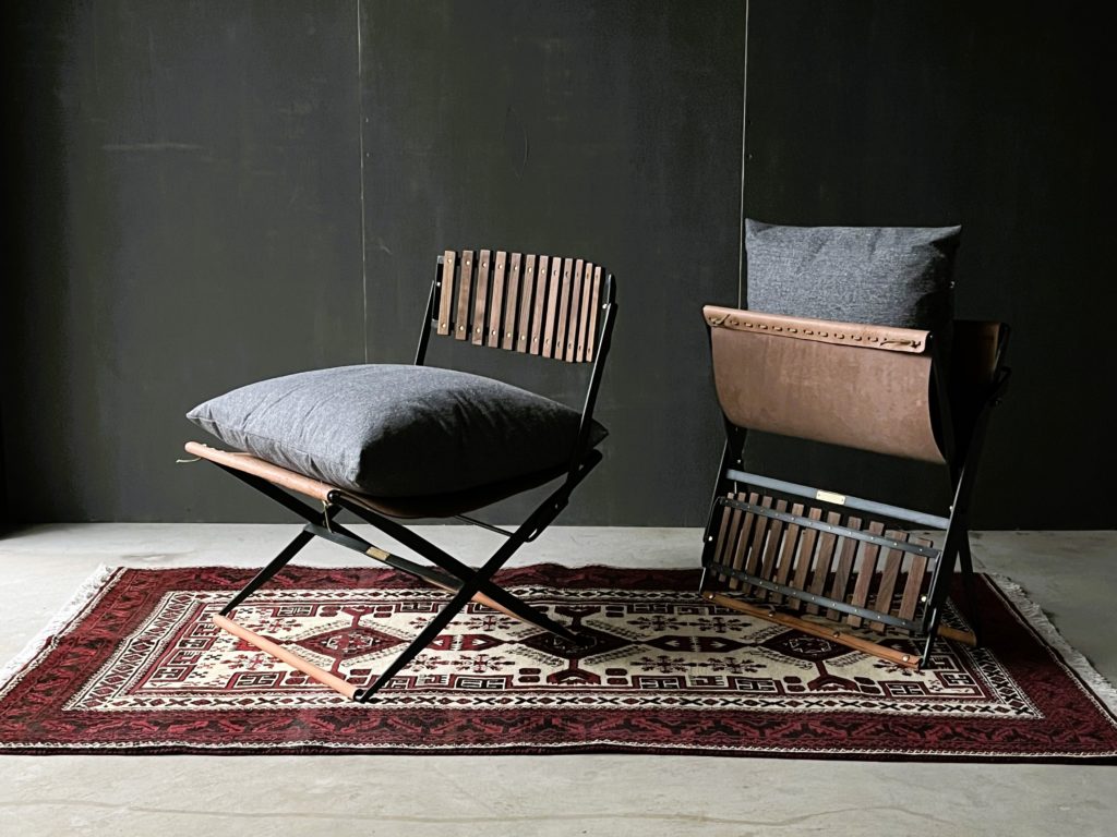 鉄と木と革で出来たハンドメイドの家具は室内でも屋外でも快適です